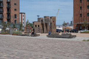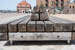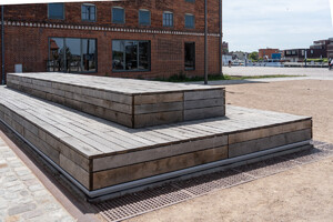 Eine der beiden Intarsien wird dabei vorrangig dem Spiel für alle Altersklassen gewidmet. Die andere Intarsie wird als offene Platzfläche angelegt, auf der unterschiedliche (spontane) Nutzungen stattfinden können. Durch kleine Markierungen im Boden werden hier zwei Boule Felder (15mx5m) und vier Kubb Felder (8mx5m) ausgewiesen. Gestalterisch orientiert sich die Platzfläche auch am historischen Vorbild. Der Hafen war ein großer Holzlager- und Umschlagplatz mit großen und kleinen Holzstapeln mit unterschiedlichsten Hölzern. Die Holzstapel werden in der Gestaltung der Sitz- und Spielelemente adaptiert und neu interpretiert.