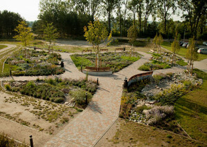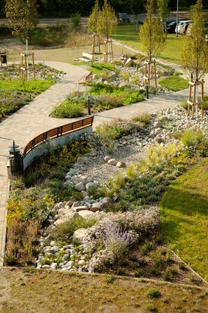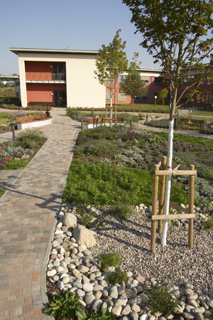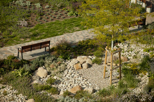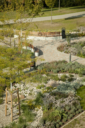 Neugestaltung der AußenanlagenIm Zuge eines Erweiterungsbaus des Krankenhausgebäudes wurden in unmittelbarer Umgebung bereits Teile der Außenanlagen hergestellt und nun um einen Patientengarten ergänzt. Entstanden ist ein Rückzugsort, der als Treffpunkt für Patienten und Angehörige dient, der einlädt zum Verweilen und gleichzeitig zur Bewegung. Der modellierte Trockenbach setzt einen landschaftsprägenden Akzent, ordnet den Raum neu und schafft so ein einzigartiges Naturerlebnis. Der Patientengarten ordnet sich räumlich zwischen das vorhandene Wegenetz ein und wird dieses effektiv verknüpfen. Dadurch ist eine blühende Landschaft mit 700m² Pflanzfläche, mit Sonnen- und Schattenplätzen, entstanden.