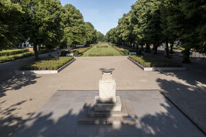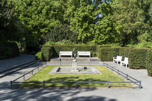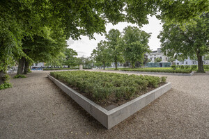 Besondere Aufmerksamkeit galt auch dem Mahnmal für die Opfer des Faschismus. Hier wurde durch streng geschnittene, immergrüne Hecken eine ruhige Fassung geschaffen, deren Ausrichtung Bezug auf die Geometrie des Gartens nimmt. Hochbeete aus Muschelkalkstein bieten zugleich Abgrenzung und Sitzmöglichkeiten. Der Durchgangsraum an der Steinstraße erfuhr durch eine neu gefasste Sitzmauer eine deutliche räumliche Aufwertung.