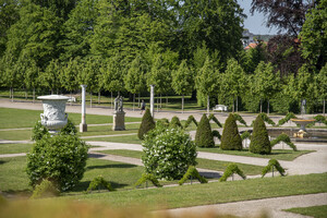 Von dem Park des Residenzschlosses ist noch die barocke Sichtachse erhalten. Erweiterungen und Umgestaltungen erfolgten im landschaftlichen Stil. In den Schlossterrassen wurden die beiden Brunnenbecken und das Bewässerungssystem instand gesetzt. Das vorhandene geometrische Wegesystem wurde überarbeitet. Der Weinberg ist allseitig von hohen Natursteinmauern eingefasst, das Gelände zusätzlich mit einer Mauer terrassiert. Eine üppige Bepflanzung erfolgte mit Sommerblumen, Stauden und Kübelpflanzen. Die Lindenalleen im Parterre wurde vollständig erneuert und verjüngen sich vom Schlossberg zum Hebetempel, so dass sich die barocke Achse optisch verlängert. Im Innenhof des Marstalls mit altem Baumbestand sind die unterschiedlichen Zugänge mit einem Plattenbelag aus Naturstein angebunden.
