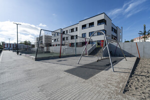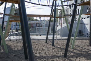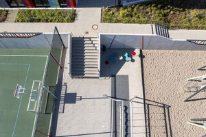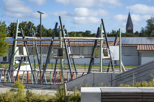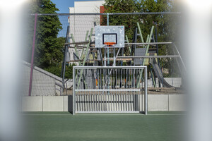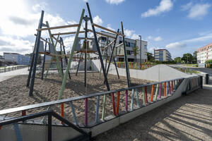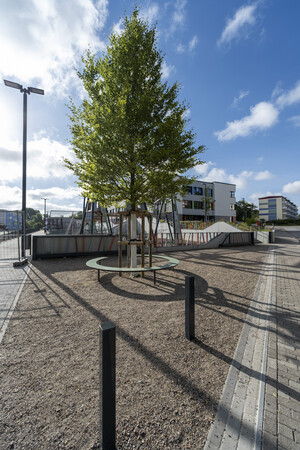 Moderne, robuste Sitzgelegenheiten – einzeln, in Gruppen oder als integrierte Elemente in den Spiellandschaften – unterstützen die vielfältige Nutzung der Freiräume. Ausreichende Abstellmöglichkeiten für Fahrräder und Roller sowie klar definierte Bereiche für Anlieferung und Schulwegverkehr runden das funktionale Konzept ab.